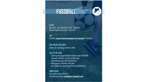 Aktive Ferien gesucht? auch in diesem Jahr gibt es wieder unser Fußball Camp. Dieses Jahr erstmalig auf dem neuen Kunstrasen Heuweg. Meldet Euch an!!!!